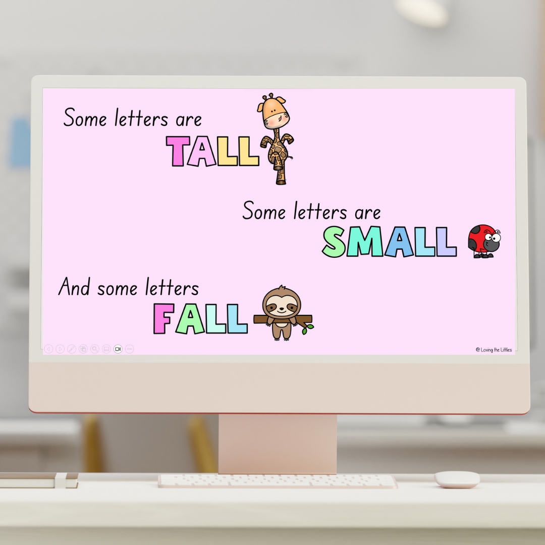 - A PowerPoint to display on your Smartboard - Use the slides to explicitly teach students about tall, small and fall letters. You can show them which line the letters sit on. Show the slides as you do your modelled writing too.