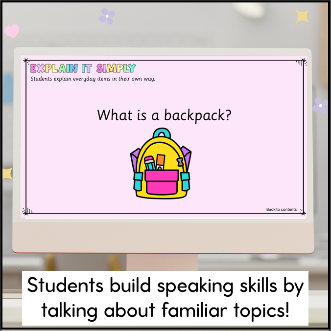 Because the prompts are based on familiar topics like food, animals, and everyday routines, students can focus on how they speak—not on coming up with ideas. It’s perfect for building confidence, encouraging sentence structure, and supporting even your quietest kids.