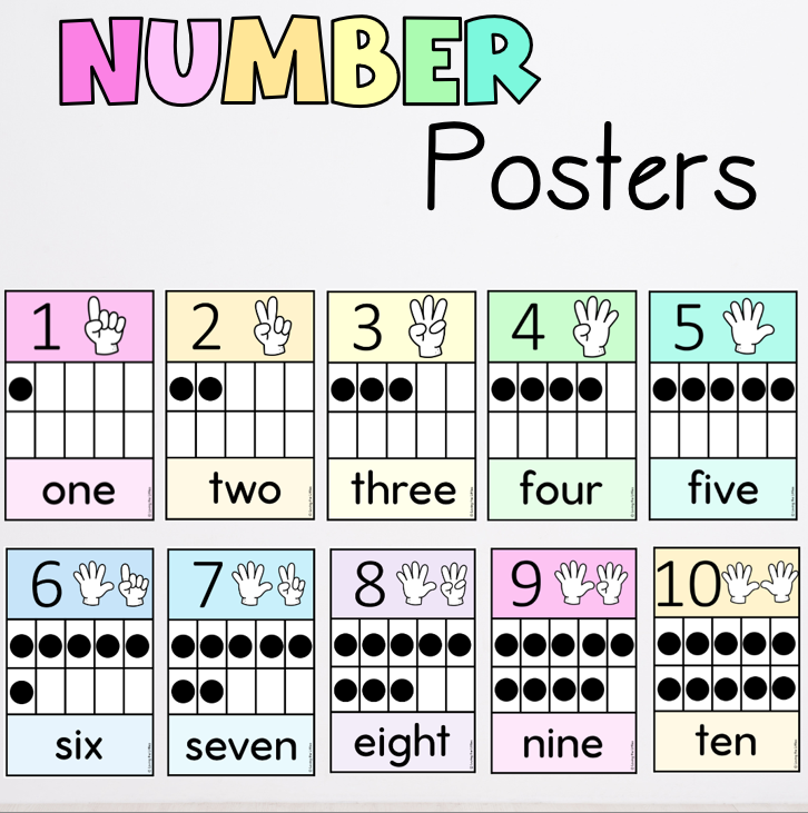 These 0-10 number posters are perfect for your classroom. They show numbers represented in multiple ways – as digits, on fingers, on a tens-frames and words. These posters are pastel coloured so are not only functional to teach about numbers 0-10, they also make your classroom look pretty!