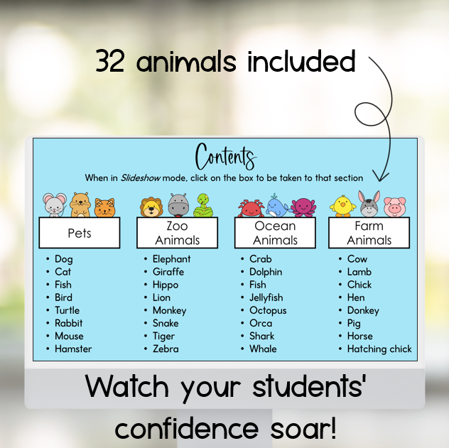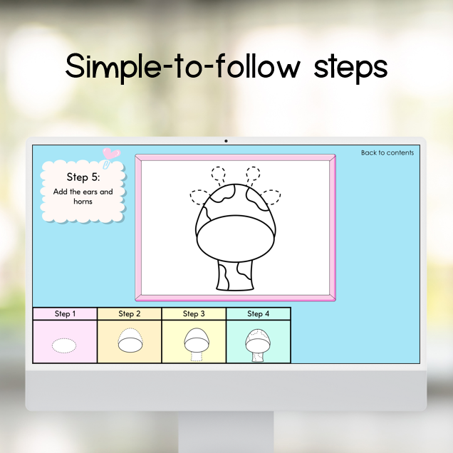 These step-by-step animal drawing slides make teaching drawing easy and explicit. Simply click through each slide to model a directed drawing where every child can succeed. No more “winging it” – you’ll have it all there at the click of a button.