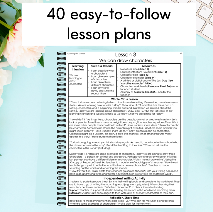 - 40 lesson plans – simply print and go! You won’t need to plan for writing for a whole term! I’ve got you covered.