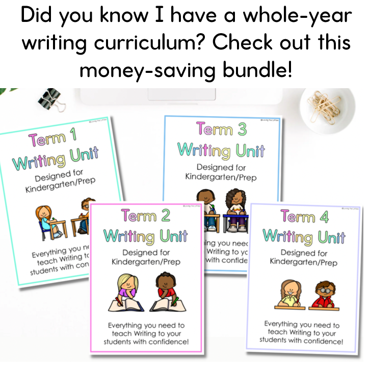 This unit has literally everything you need to teach writing to your Kindergarten/Prep students in Term 4. If you’re a graduate teacher, new to teaching Kindergarten/Prep, or you just want to reclaim your nights and weekends, then this resource is for you! Featuring 40 lessons, each lesson slowly builds upon the previous ones so your students have the confidence and ability to grow as writers. With detailed lesson plans, digital learning intentions and success criteria and all your resources included, you won’t need to worry about planning writing for the whole of Term 4. I’ve done it for you!