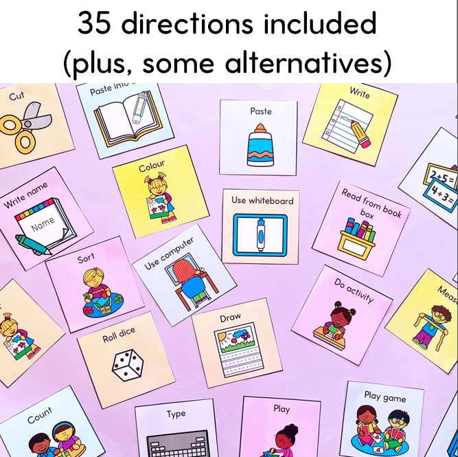 - 35 direction cards with child-friendly images. Even your non-readers will be able to understand what they have to do